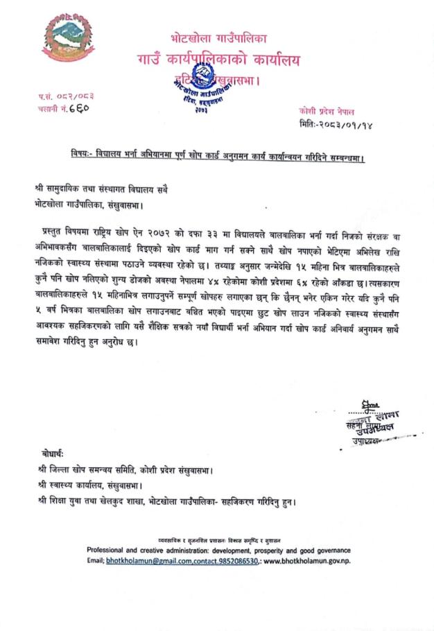 विद्यालय भर्ना अभियानमा पूर्ण खोप कार्ड अनुगमन कार्य कार्यान्वयन गरिदिने सम्बन्धमा।
